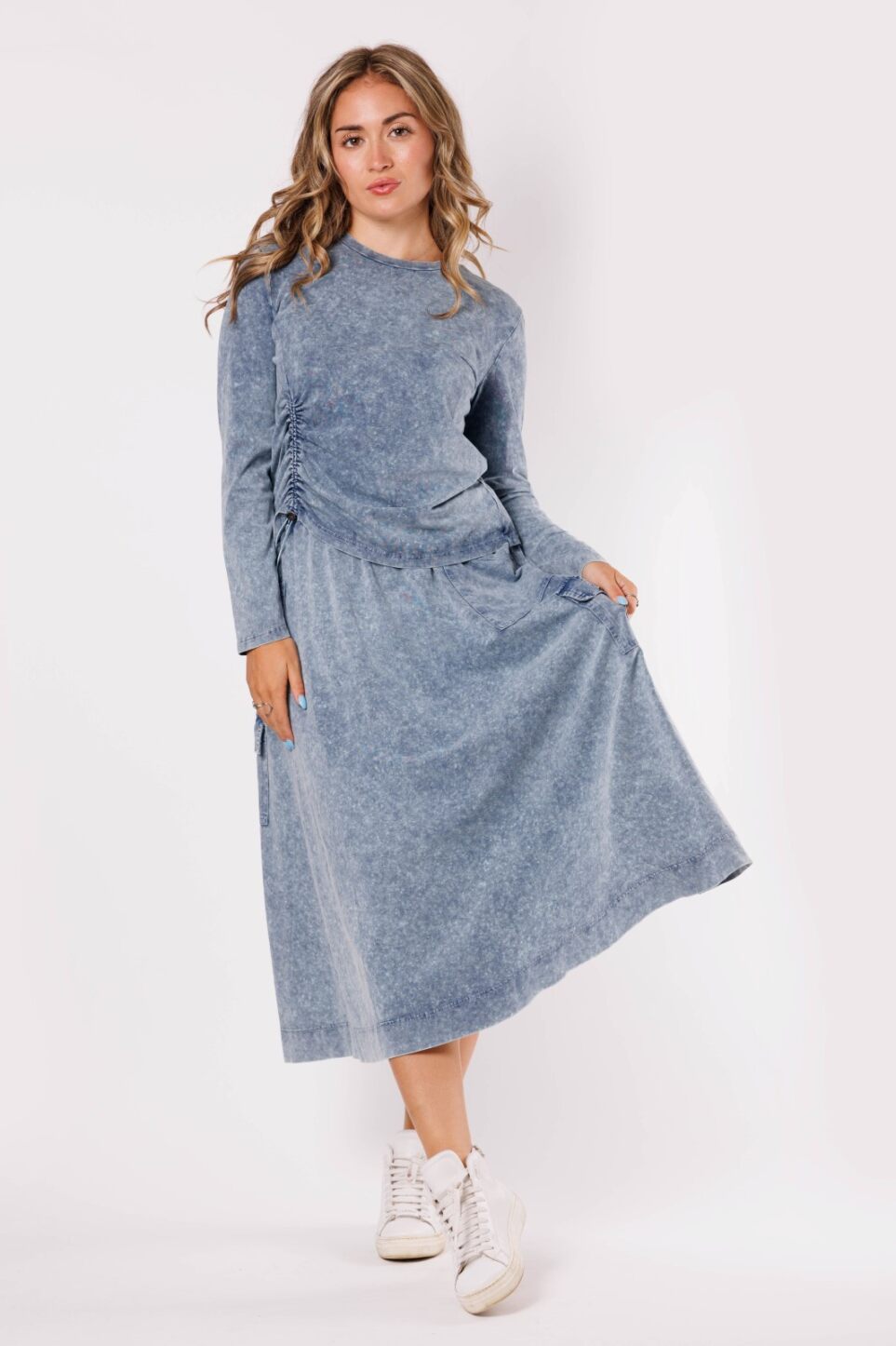 Gathered Elastic Waist Maxi Denim Skirt